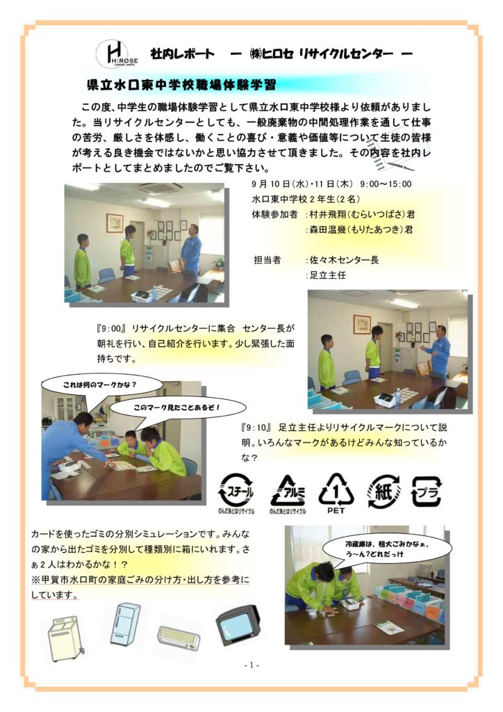 県立水口東中学校 職場体験学習